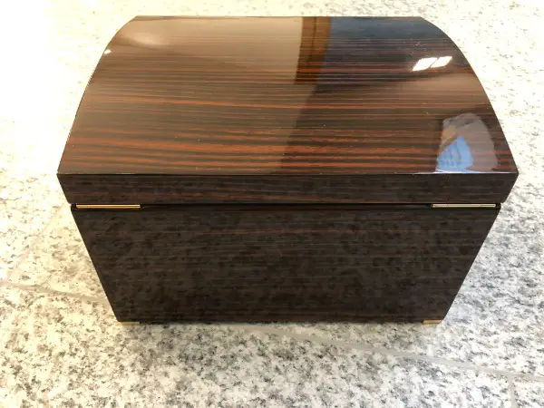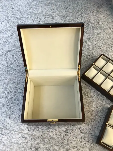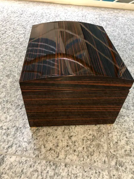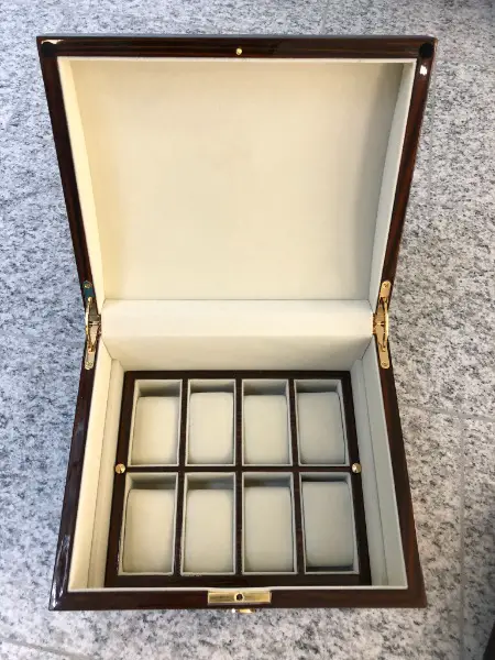 Edle Uhrenaufbewahrungsbox für bis zu 16 Uhren. - Massivholz, in aufwendiger Handarbeit gearbeitet, mehrfach geschliffen. - Masse: Breite 27.5 cm, Tiefe 23,5 cm, Höhe: 18 cm - Verschraubte Messing Scharniere - Innenausstattung aus cremefarbenem, weichem Velour -Hervorragende Verarbeitung der Ecken und Kanten