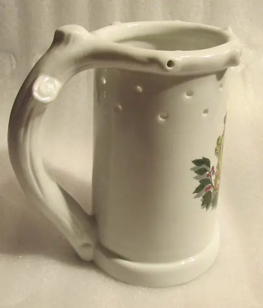 Krug nimmt man einfach in die linke Hand. Halten Sie mit dem Mittelfinger das kleine Loch in des Henkels Innenseite zu. Mit dem Zeigefinger halten Sie das erste Loch am oberen Rand links vom Henkel zu. Und schon beginnt die Trinkfreude! Rechts vom Henkel, erstes Loch ist die Sauföffnung, jedoch nie den Krug zur Seite neigen, sondern Senkrechthaltung zeigen und nun mit Geniesser-Augen kräftig stark das Bier absaugen. Bald schon ist der Bierkrug leer, Hexerei - und doch nicht schwer! Material: Keramik, Inhalt: für ca: 760ml, Füllmenge bis Löcher. 19cm hoch. Krug Durchmesser 11 cm. Grösse mit Henkel 17 cm