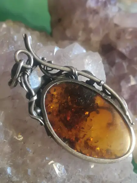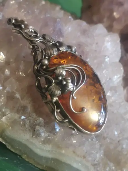 Schöner Anhänger aus 925/-er Silber im Antik-Finish mit feinen Verzierungen gearbeitet. In einer Zargenfassung wurde ein ca. 4 x 2,5cm grosser Naturbernstein mit mehreren Einschlüssen eingearbeitet. Die Grösse mit Öse misst ca. 6 x 3cm, die Öse selbst eignet sich für Ketten bis zu einer Stärke von ca. 4mm.