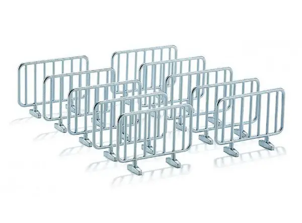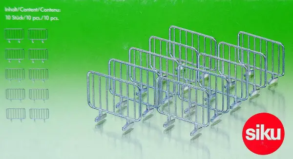 Zubehörartikel bestehend aus 10 Metall-Absperrgittern. Nutzbar einzeln oder im Zusammenspiel mit verschiedenen SIKU-Modellen der Farmer32-Serie.