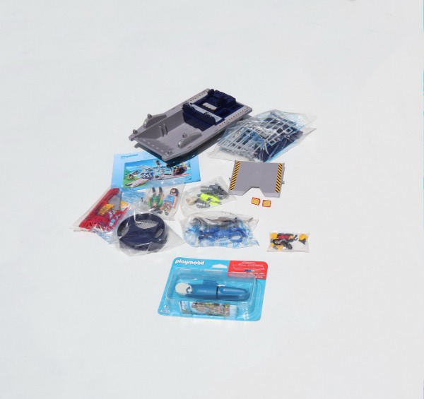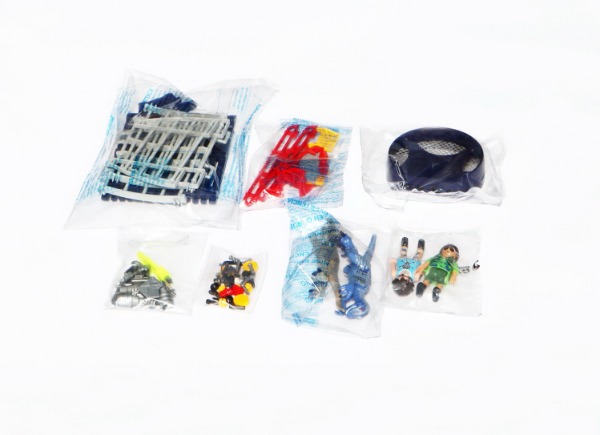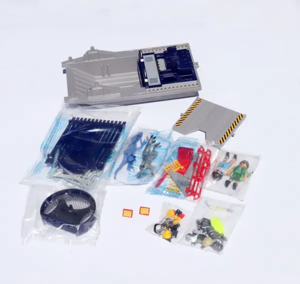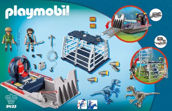 - Figuren: 2 Männer; Tiere: 2 Dinosaurier; Zubehör: 1 Propellerboot, 1 Dinokäfig, 3 Scheinwerfer, 1 Enterhaken mit Seil, 1 Kanister, 1 Ausgiesser, 1 Buschmesser, 2 Pistolen, 2 Pistolenholster, 1 Kappe, 1 Schärpe, 1 Halterung, 2 Gefahrenschilder