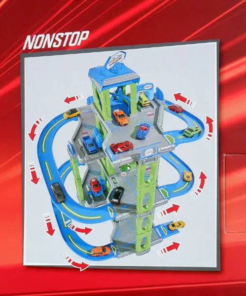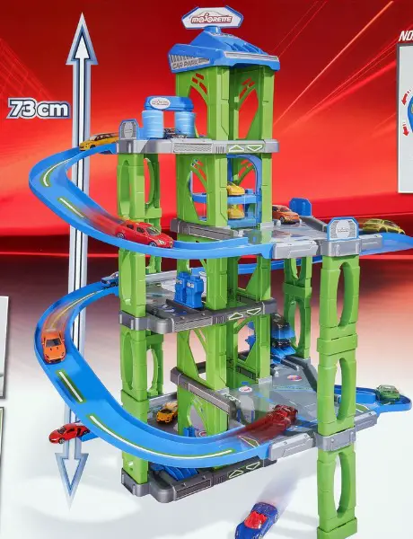 Diese Car Park Garage von Majorette besteht aus ganzen fünf Etagen und beinhaltet einen Turmaufzug, 2 Tankstellen, 2 Hebebühnen und 1 Autowaschstrasse. Die weit geschwungenen Verbindungen vom oberen bis zum unteren Deck ermöglichen ein selbstständiges Durchfahren der Etagen.