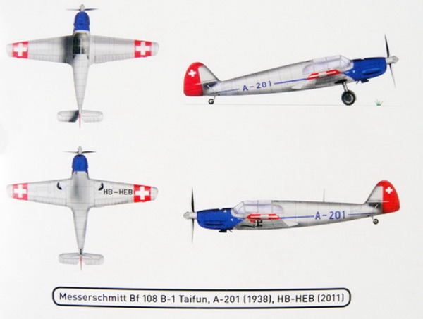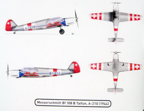- Decals für die Schweizer Lufwaffe Versionen Bf 108 B-1 Taifun A-201/HB-HEB (1938) oder Bf 108 B Taifun A-210 (1944)