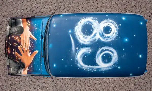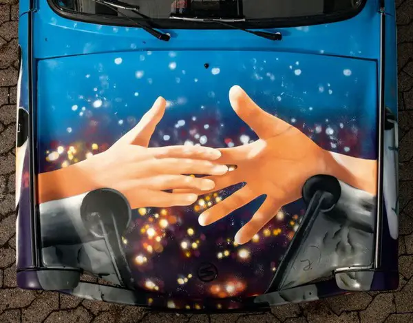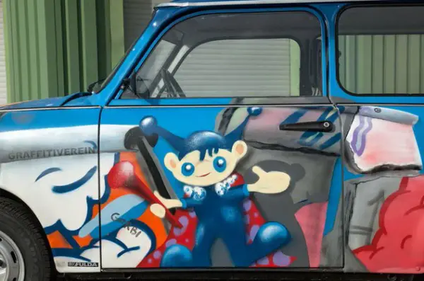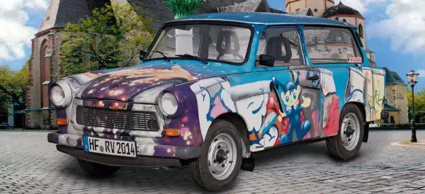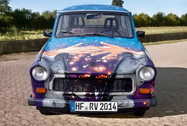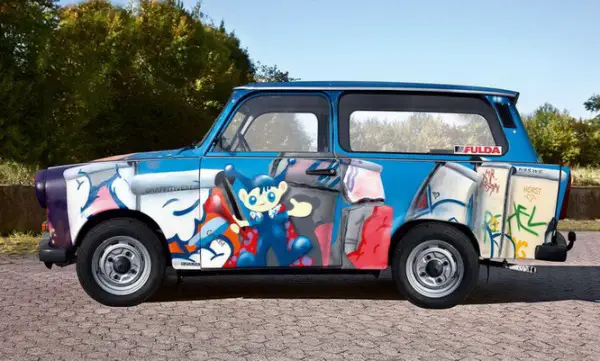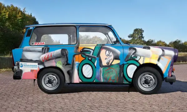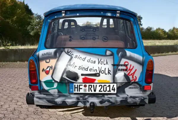 Auto mit Motiven zum Mauerfall verziert. Das einzigartige, fahrbereite