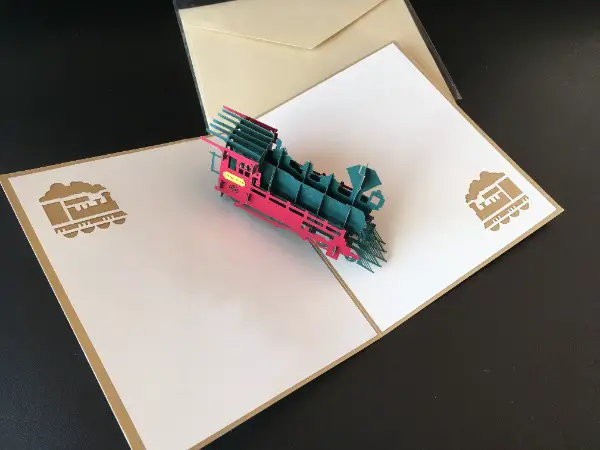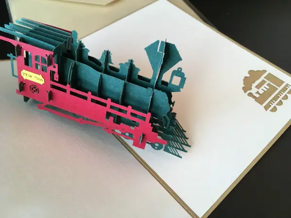 Die grün-rote Dampflok entfaltet sich beim öffnen der Karte.