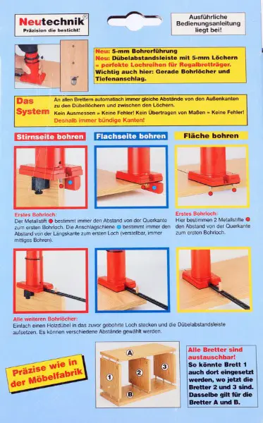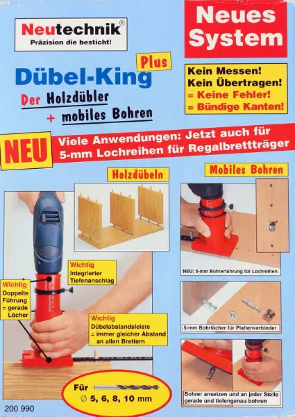Bohrmaschine zum schnellen und genauen Holzdübeln. Der berühmte Holzdübler aus dem TV jetzt auch für 5-mm Regalbrettträger. Kein Messen! Kein Übertragen! = Keine Fehler! = Bündige Kanten! Doppelte Führung = gerade Löcher! Auswechselbare Bohrerführungen für 5,6,8,10 mm.