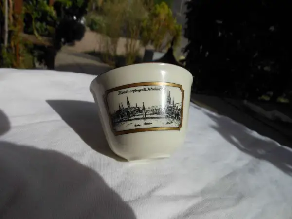 schöne alte aus den (60) jahre 5 Moka Espresso Tassen und Unterteller mit dem Motiv vom alten Zürich anfangs 18. Jahrhundert (10 teilig)