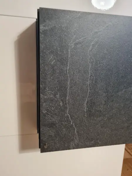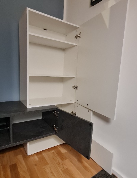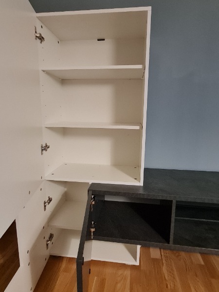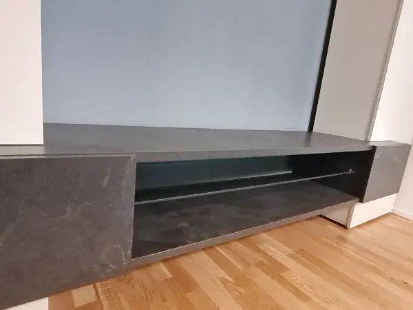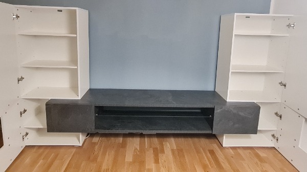 3 teilige edle Wohnwand im minimalistischen Design bestehend aus 2 Schränken mit weiss lackierten Hochglanztüren und einem eingehängtem Lowboard in Schieferoptik mit Glasboden. Das Lowboard wird seitlich in die Schränke gesteckt, sehr stabil, kein Bohren in der