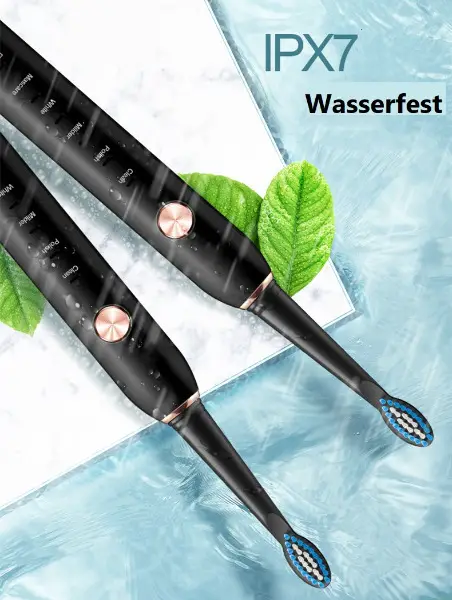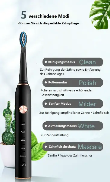 Motor, der pro Minute 38.000 Schwingungen erzeugt. Durch die erzeugten Schallwellen, wie auch die Vibration des Bürstenkopfes, werden die Zähne und auch die Zwischenräume gereinigt.