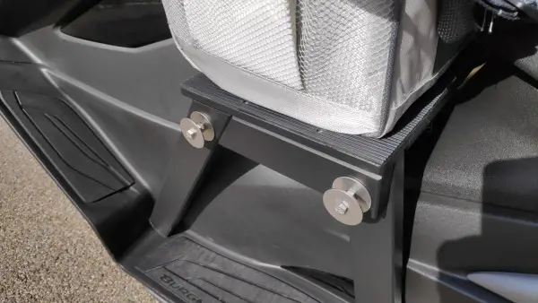 Das Teil sollte nach Plan über die Befestigungsschrauben abgespannt und gesichert werden. Da es beim testen so gut und stabil in seiner Position stehen bleibt, habe ich auf die Sicherung verzichtet. Man bedenke, dass die Tasche zwischen den Beinen eingeklemmt ist und somit seitlich absolut stabil stehen bleibt. Längs ist durch den vorderen Anschlag der Beine auch kein verrutschen nach vorne möglich und nach hinten steht die Tasche am Sitz an.