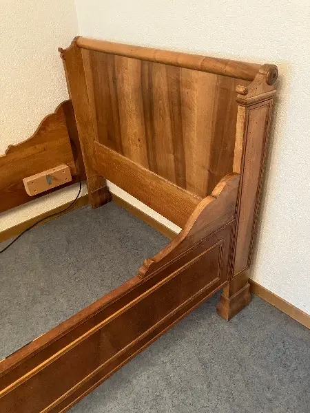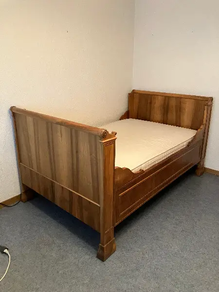 Dieses schöne Nussbaum Holzbett habe ich vor ca. 10 Jahren total restauriert. Neuer Rost und Madratze anfertigen lassen. (Spezialmasse) 180 cm x 110 cm. Wurde ab und zu als Gästebett benutzt. Alles ist noch in sehr gutem Zustand.