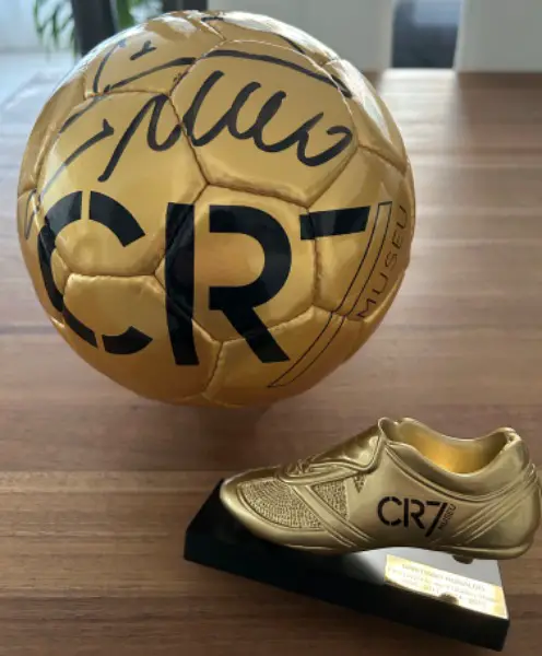 Ball persönlich von Ronaldo signiert. Sie bekommen dazu das Original Zertifikat mit Beweis Foto das die Echtheit des Autogramm beweist. Dazu gibt es noch die CR7 Trophäe aus Metal dazu.