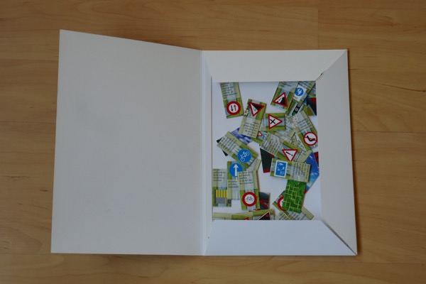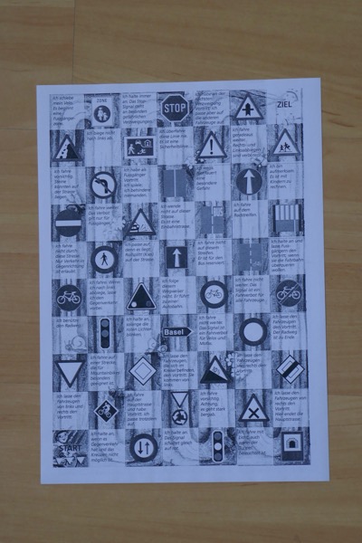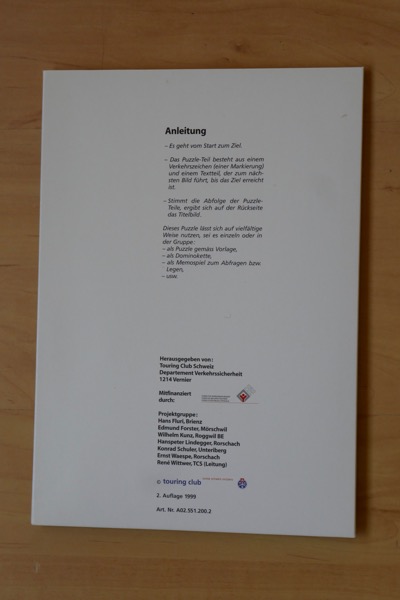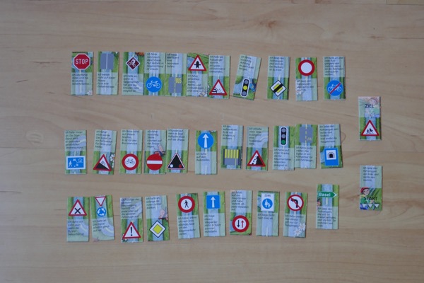 Das Puzzle-Teil besteht aus einem Verkehrszeichen (einer Markierung) und einem Textteil, der zum nächsten Bild führt, bis das Ziel erreicht ist.