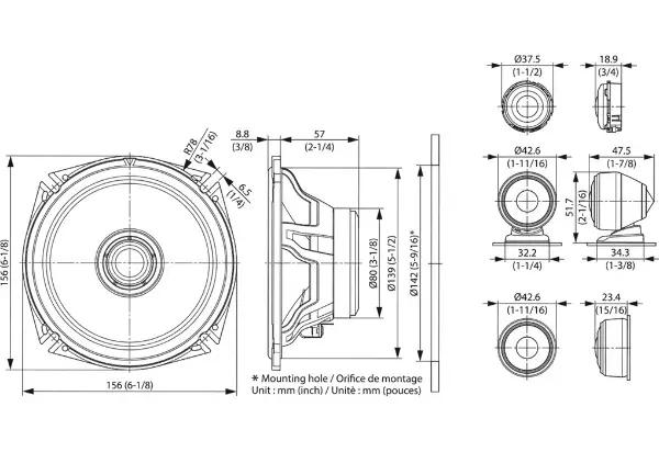Spitzenbelastbarkeit180 WNennbelastbarkeit45 WMaterial der KonusmembranGlasfaser-KonusAbmessungen Woofer Konus156mm øStaubschutzkappeOptimierter Phase Plug AufbauLautsprecherkorbAluminiumdruckgussLautsprechersickeGummiArt der ZentrerspinneAFC, Tornado-förmigEmpfindlichkeit83dB/W/mÜbertragungsbereich34 Hz ~ 56 HzLautsprecherimpedanz4? Abmessungen (B x H x T)156 x 156 x 65,8 mmEinbautiefe57 mmDurchmesser des Befestigungslochs Ø142 mmGewicht des Lautsprechers810 gr