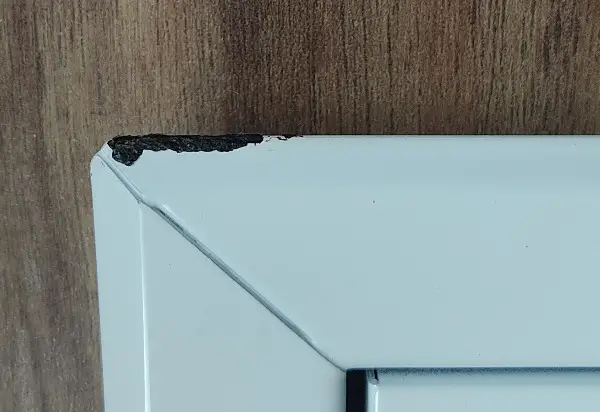 Bei der unteren Kante hat es eine kleine Farbabblätterung. siehe Foto.