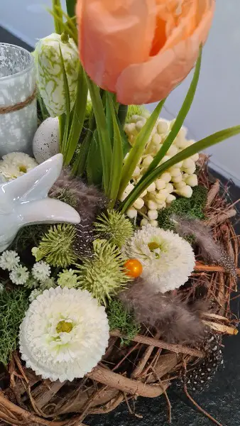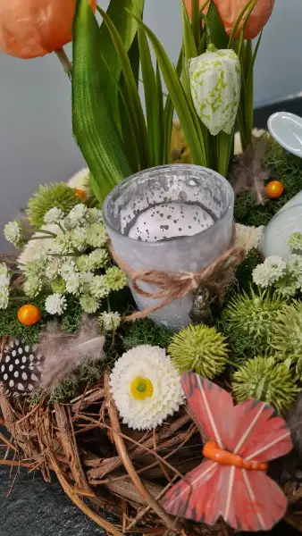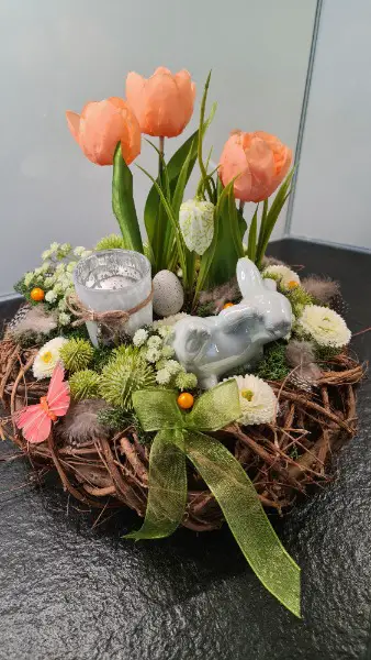 Kranz, 30cm Durchmesser, mit Porzellanhase Windlicht und Seidenblumen, Federn..... dekoriert.