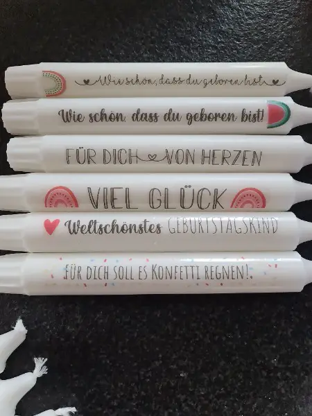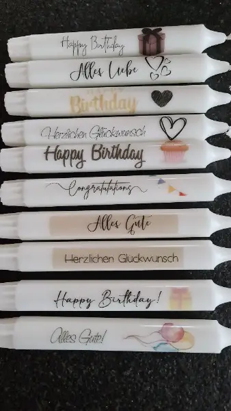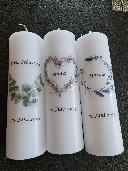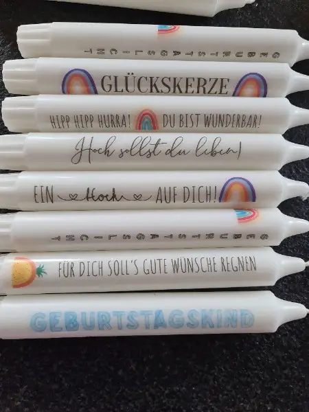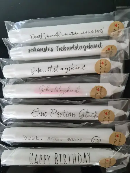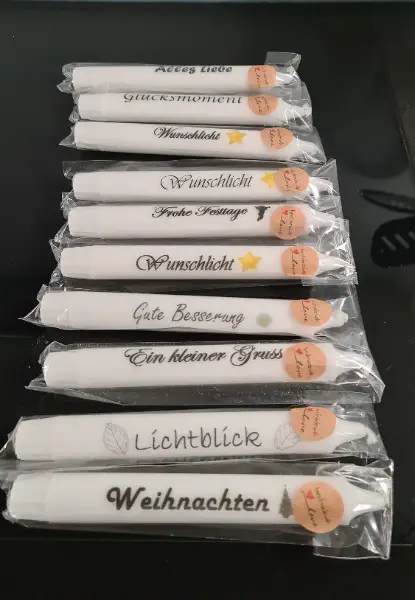 Ich mache diverse Kerzen mit Botschaften. Auch mit Text nach persönlichem Wunsch z.B als Gastgeschenke, Kundengeschenke.