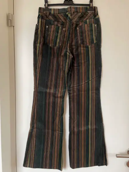 Flared Schlaghose Gr. 36, petrol-braun-hellgrün-braun-beige gestreift, Innenbeinlänge ca. 79 cm, Beinweite unten ca. 27 cm, Material 96%