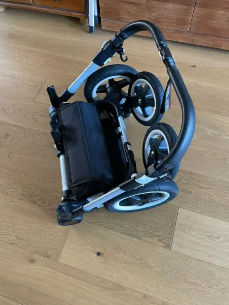 Der Kinderwagen ist geländegängig und hat schwenkbare Räder. Ausserdem ist er klappbar und hat einen grossen Einkaufskorb.