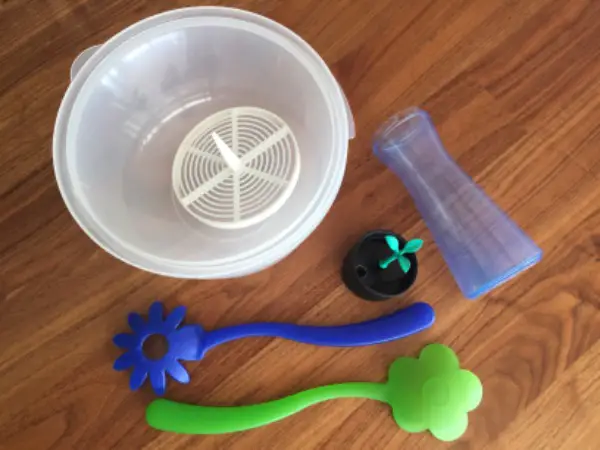 Salat-Set: Aufbewahrungskugel Frischhaltebox, Ø 23 cm, Höhe 20 cm / Shaker, Höhe 21.5 cm / Besteck Länge 32 cm,