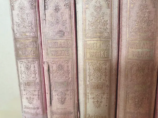 Einige Bänder aus einer grossen Zusammenstellung der Werke Christoph Martin Wielands. Verlegt von Gustav Hempel. Alles Hardcover, Buchrücken goldverziert allerdings bereits recht verblichen, gut erhaltene Prägung des Umschlages (Prägung Wielands) siehe Foto. Konnte im Netz keine so umfangreiche Sammlung für ansatzweise den genannten Preis finden.
