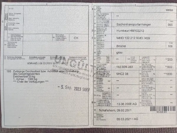 Gesamtgewicht 1000 kg, Nutzlast 800 kg, Leerg. 200 kg
