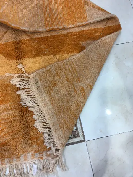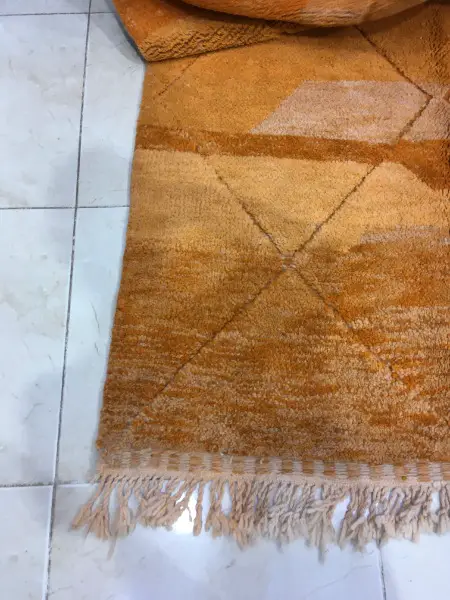 Le tapis Béni Ouarain est tissé à partir de laine de mouton 100% naturelle, ce qui lui confère une texture douce. Il est noué à la main sur un métier à tisser traditionnel en bois selon un savoir-faire ancestral transmis à chaque génération.