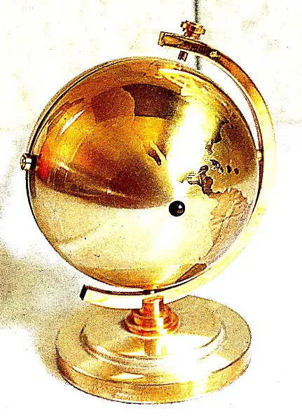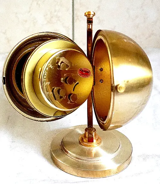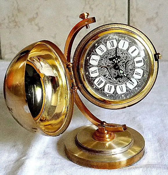 Es ist ein seltener, alter, funktionstüchtiger Tischwecker / Uhr mit der Weltkugel und Platz für ein Foto der Liebsten im Deckel innen. Masse: H 13cm, Ø 8cm.