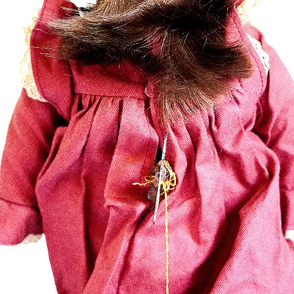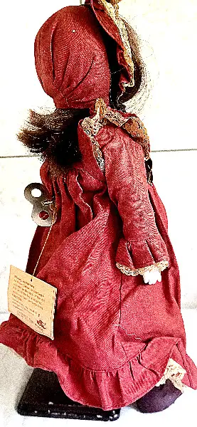 Puppe mit integrierter Spieldose. Der Aufziehschl?ssel hat die Dame am R?ücken stecken. Die Melodie ist: "In 80 Tage um die Welt". Die Madam schaut so treuherzig in die Welt, sie ist wirklich super! Bitte beachten Sie auch ihr schönes, zeitgem?sses