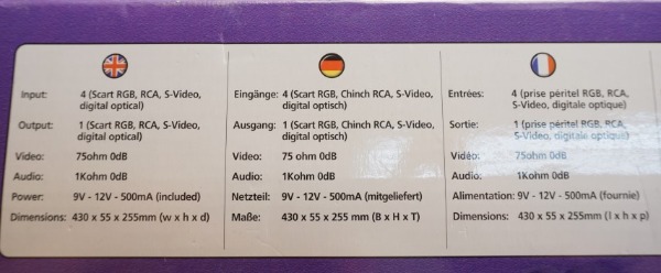 Lieferumfang: 1xUmschalter, 1xFernbedienung, 1xSteckernetzteil, 1xS-Video - S-Video Kabel, 1xChinch - Chinch Kabel, 1xScart Kabel