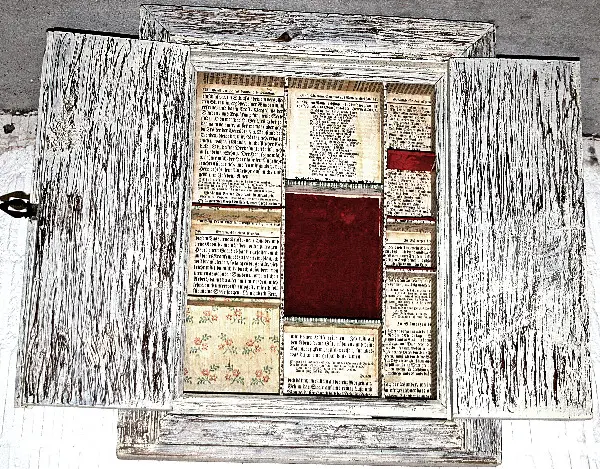 Es ist ein wunderschöner Wandkasten, Masse: B 50cm, B Offen 80cm, H61cm, T 11cm. Bitte bachten Sie, das das Ganze eine Arbeit einer Luzerner Künstlerin ist und wirklich sehr schön aussieht. Natürlich ist es ein Einzelstück.