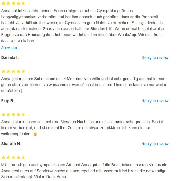 Ich verfüge daher über ein vertieftes Wissen in diesen Fächern. Zusätzlich bringe ich bereits Erfahrung im Einzel- und Gruppennachhilfeunterricht mit. So habe ich in der Oberstufe des Gymnasiums über einige Jahre den Schülern aus der Unterstufe Nachhilfe gegeben. Dabei haben sich deren schulische Leistungen tatsächlich verbessert. Die Schüler bestätigten mir immer wieder, Wissensinhalte gut und verständlich vermitteln zu können. Daher bin ich auch in Besitz vieler Theorie- und Übungsblätter.