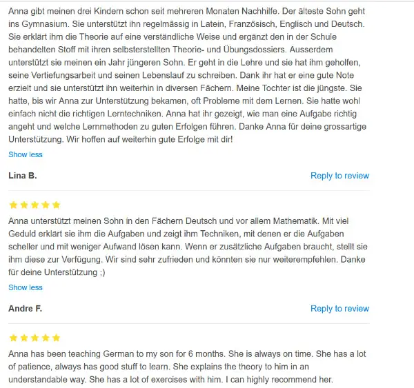Ausserdem habe ich bereits 18 Primarschüler, 9 Sekundarschüler und 5 Erwachsene unterrichtet. Alle von mir unterrichteten Schüler haben nach wenigen Wochen starke Verbesserungen erzielt und ihre Noten sind ersichtlich angestiegen.