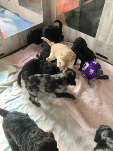 Wurfanzeige:9wunderschöne Welpen sind geboren. 4 Mädels und 5 Jungs in denFarben schwarz, black an tan, creme und merle. Eltern sind natürlich korrekt untersucht und dieMama merle frei, der Papa ist ein merle