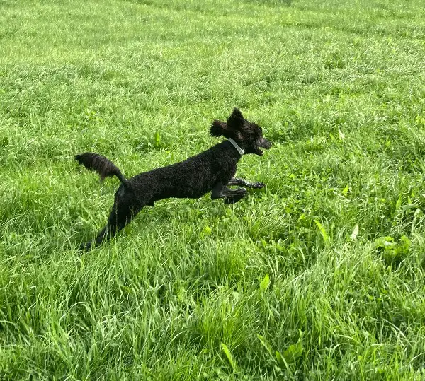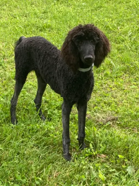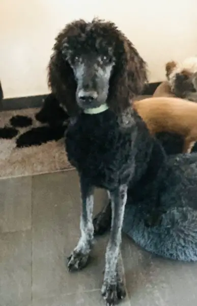 Sam ist ein 9 Monate alter Königspudel in der speziellen Farbe brindle. Er istein aktiver Jungspund der beav an der Leine geht, sich mit jedem