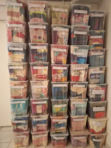 Das gesamte Ware ist zum Teil schon nach Kleidergroesse sortiert und ist jetzt bei mir, weil ich Mitte Februar die Laden wegen Umbau verlassen musste.