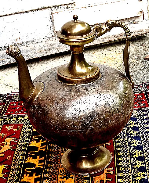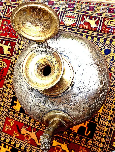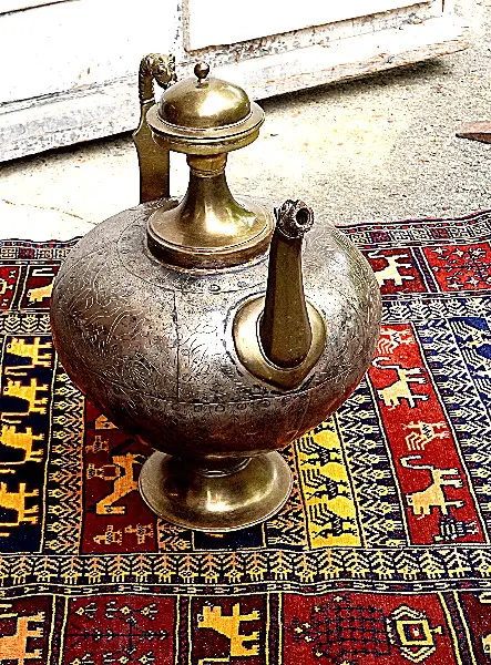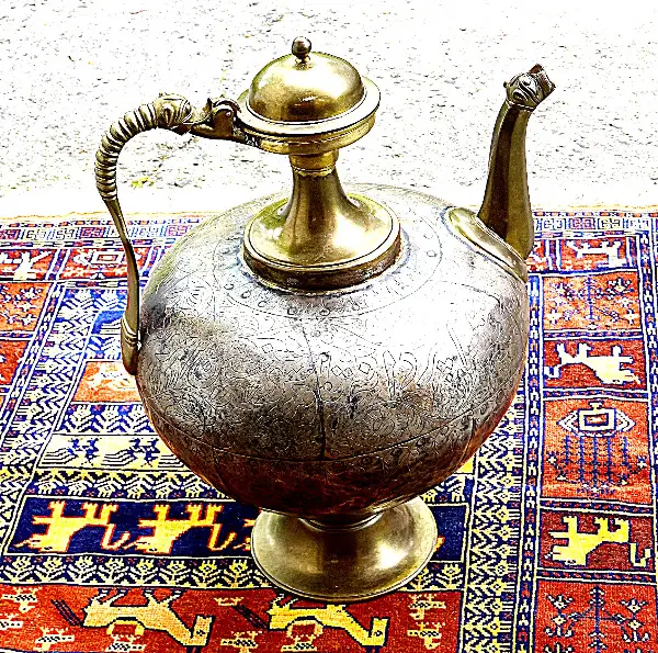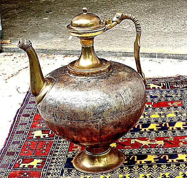 Es ist eine seltene, grosse, antike Moghal Atfaba Teekanne, aus einem Maharatscha-Haus in Rajasthan, heutiges Indien. Masse: H 55cm, Ø 32cm, Gewicht: ca. 15kg. Bitte beachten Sie, dass es sich hier um ein sehr schönes, seltenes Decko Teil handelt.