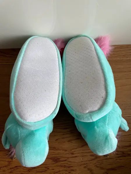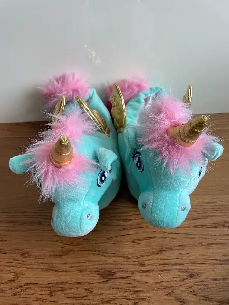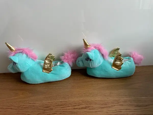 Neuwertige, kuschelige schöne Finken / Hausschuhe in Form eines Einhorns mit goldenen Flügeln und Horn