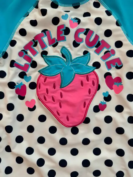 Neuwertig, da kaum getragen: Schmuckes UVP Badekleid / Badeanzug (Einteiler) mit integriertem Sonnenschutz (UV) und Erdbeere sowie Schriftzug "LITTLE CUTIE" und Sonnenhut