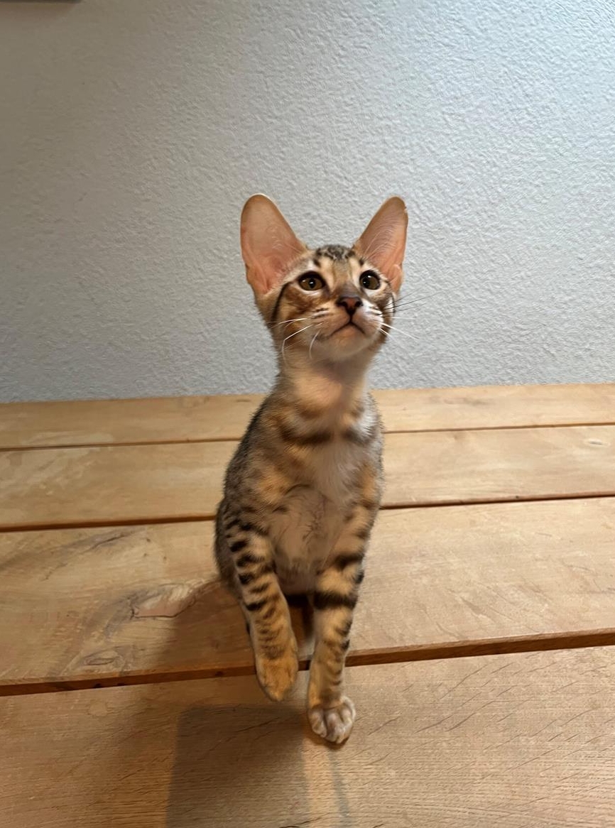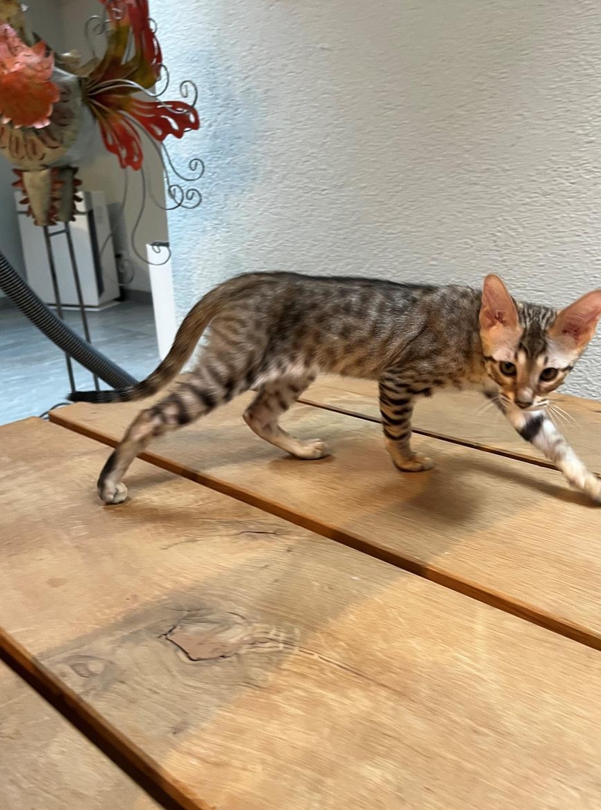 En ce moment, nous avons à vendre des chatons SBT F6 mignons, très affectueux et joueurs, bien typés, dans les couleurs brown-black spotted et snow (dob 6.3.2024) . Il y a un mâle et deux filles, Sammy et Macy qui ne sont pas encore attribués. Les chatons Savannah sont prêts à déménager. Ils sont vaccinés, vermifugés, pucés et ont un pedigree (TICA) . Ils peuvent être visités avec plaisir.