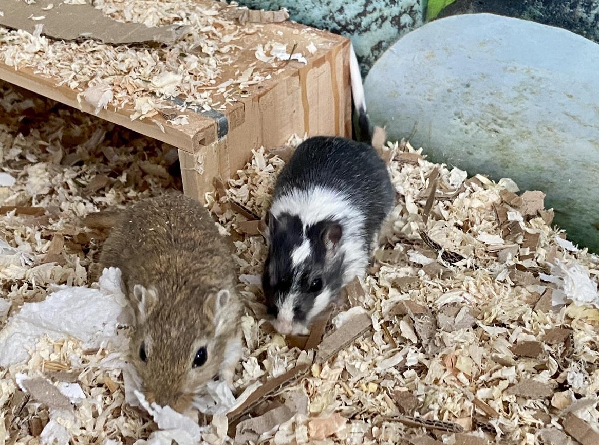 Diese beiden Rennmausdamen (Anni halbjährig und Chuppa 1.5 Jahre alt) suchen ein liebevolles Zuhause. Vor allem die schwarz-weiss gescheckte Chuppa ist sehr zutraulich und kommt gern auf die Hand. Sie ist klar die Anführerin und Anni, ein hübsches Agouti-Weibchen, traut sich dank ihr mehr zu. Sie hat sich von einem verschupften Jungmäuslein zu einer neugierigen Teenagerin entwickelt.