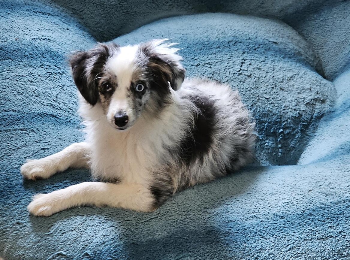 Lumi kann bereits ein bisschen alleine bleiben. Die junge Miniature Australian Shepherd Hündin ist bei uns schon stubenrein. Läuft schon an der Leine und lernt bereits