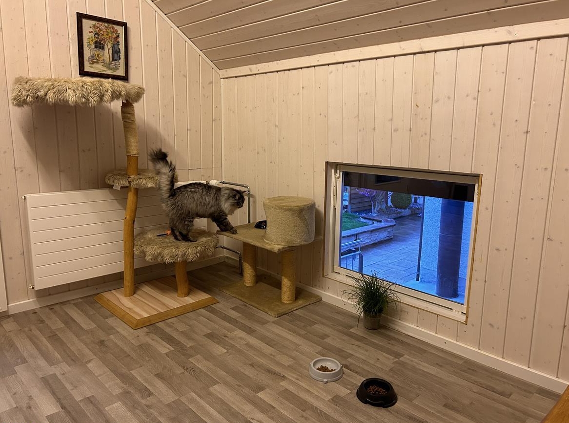 Raum ausgestattet. Ebenfalls bieten sie die Möglichkeit an die frische Luft zu gehen. Der gedeckte und eingezäunte Aussenbereich ist jederzeit zugänglich und ein beliebter Ort für die neugierigen Büsi`s