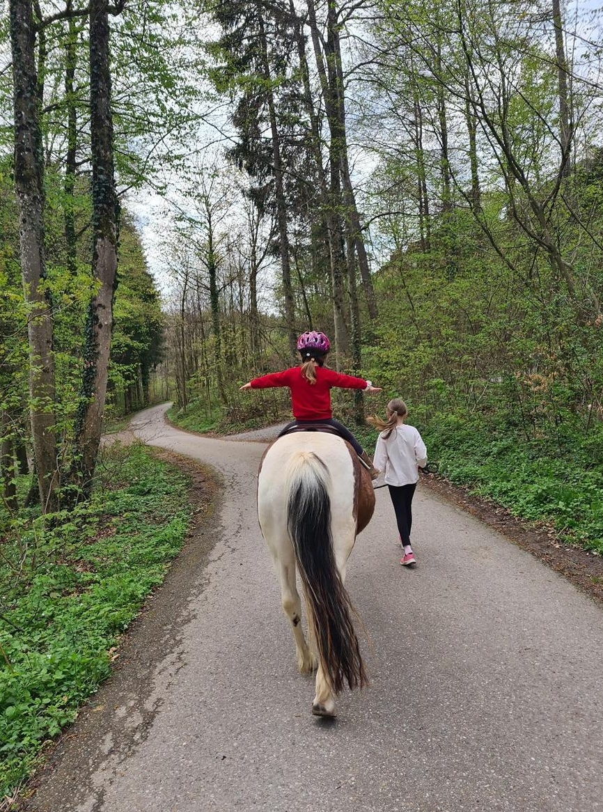 Stall tolles Ausreitgelände mit Wald- und Feldwegen, das ebenfalls für die Reitstunden genutzt werden kann. Zur Verfügung für die Stunden stehen drei tolle, kindererfahrene Ponys (115cm, 125cm, 145cm) und ein