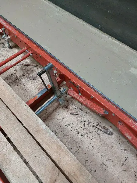 Blockbandsäge Wood Mizer LT 15, Schnittlänge von 7.40, (vier Segmente a 1.95 m) mit elektrischer Höhenverstellung und elektrischem Vorschub, Schnittstärkenrechner SW 10, Stammausgleicher, Abdeckplane, 30 Sägebänder und diverse Ersatzteile.