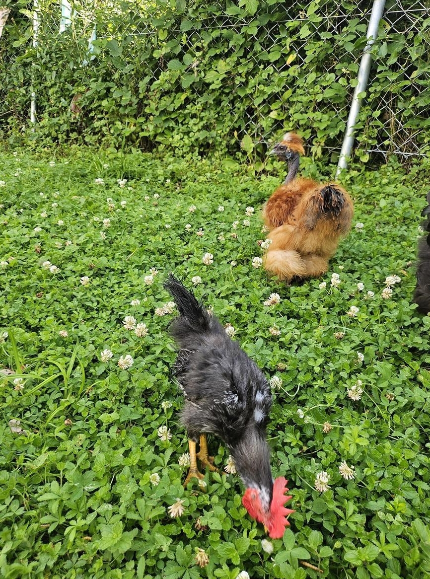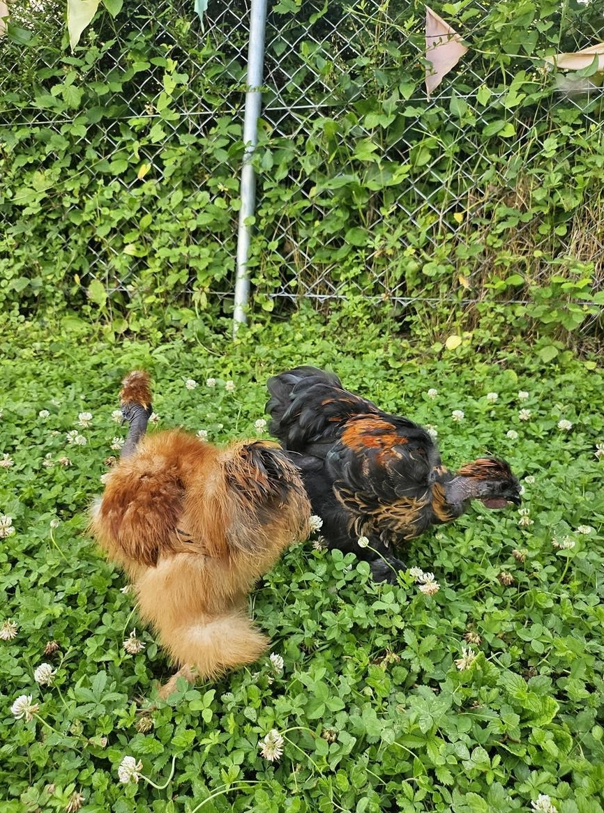 Seidenhuhn Hähne aus der "US Show Girls"-Linie sowie 1 Chabo-Mix Hahn seidenfiedrig. Die Seidenhuhn Hähne haben wir selber ausgebrütet (Naturbrut) und sind aktuell 13 Wochen alt (Stand: 29. Juni 2024) . Die Tiere sind zahm, Kinder und Hunde gewöhnt.