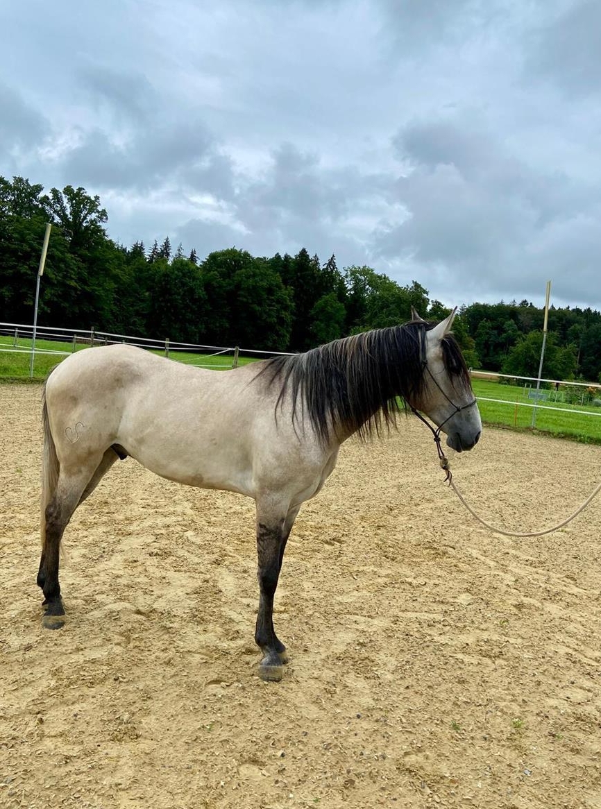 Lusitano Wallach, dass er Wallach etwas ganz besonderes ist. „Mausfalbe" mit Aalstrich und Zebramusterung an den Beinen, schön ursprünglich, elegant präsentiert er sich in einem korrekten Gebäude, eher zierlich und entsprechend für eine weibliche Partnerin geeignet, liebt der Wallach den Kontakt und zeigt willig seine Bereitschaft immer zu lernen. Der Lusitano Wallach ist ein absolutes Herdentier und möchte Kontakt zu den Leittieren, da fühlt er sich wohl und zeigt auch dem Menschen viel Respekt und Zuneigung. Mit seinen 4,5 Jahren hat der Lusitano Wallach viel vom Boden aus gelernt, ist auch bereits angeritten und will nun zu seiner Lebenspartnerin finden, die mit viel Liebe und Engagement den weiteren gemeinsam Weg zu gehen bereit ist.