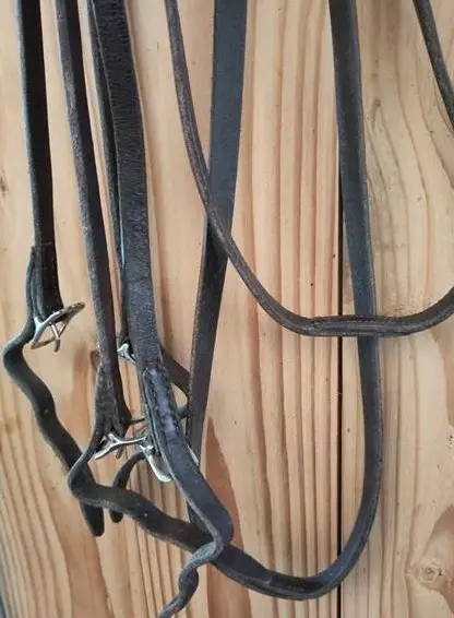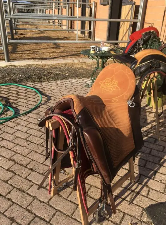 Stoff als Sitzbezug kommt zusammen mit einem Zaum - inkl. Kandarenzaum - in gleichem braunem