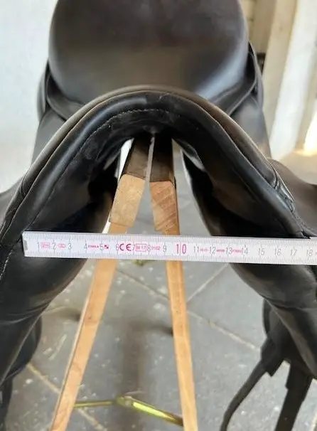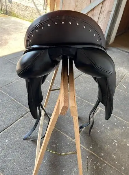 Leder mit Träne in Lack, Strassapplikationen am Hinterzwiesel und Steigbügelriemenhalter. Ist ein Masssattel, eher weite Kammerweite, 17,5 Zoll. Weitere Infos zum Dressursattel auf Anfrage.