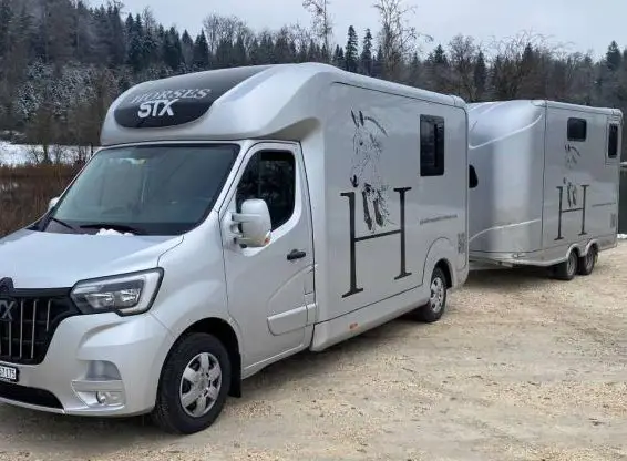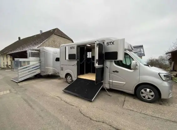 Anhänger Steinsberger ANKA, beide mit Rückwärtsverlad und Freestand. Die Pferde sind während der Fahrt Video- und Temperaturüberwacht. Beide Fahrzeuge können auch für Fohlentransporte eingerichtet werden.